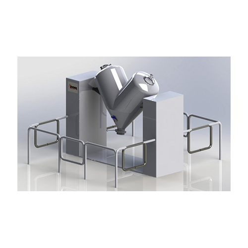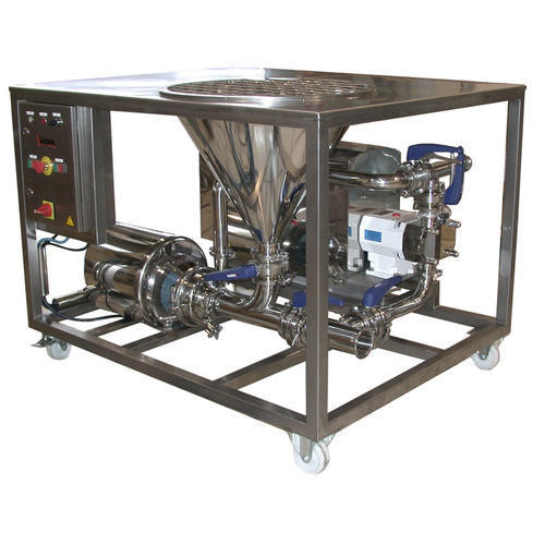 The product is recirculating while the solids are manually or automatically added through the hopper of the blender.