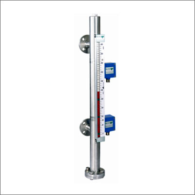 Through the directional magnetic field of the permanent magnet system in the cylindrical float, the magnetic rollers, through the wall of the stand pipe, are turned through 180°